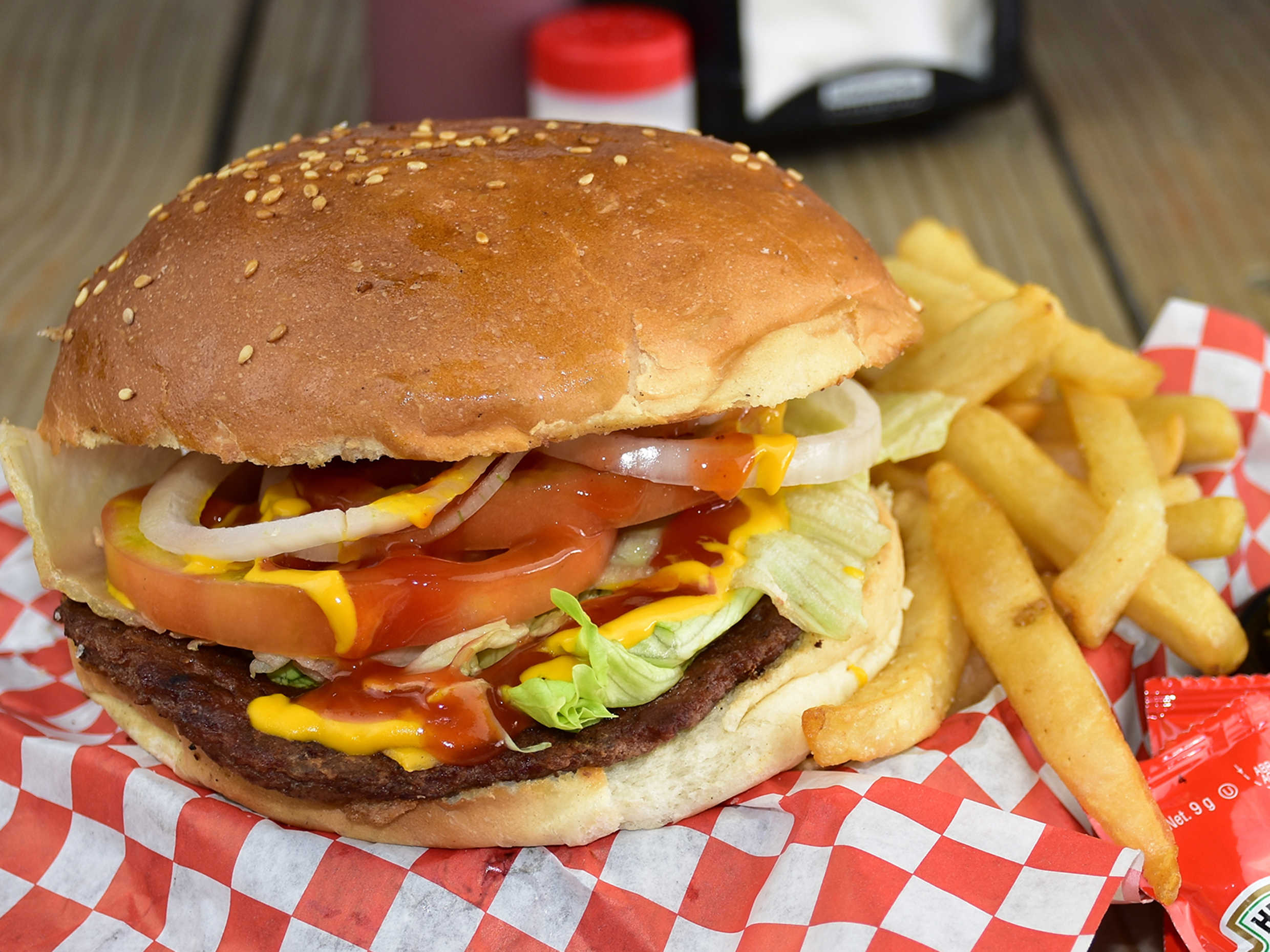 Hamburguesa Clasica, Carne de 100 g acompañada queso amarillo fundido, mayonesa, kétchup, mostaza y vegetales frescos. Servida con una porción de papas