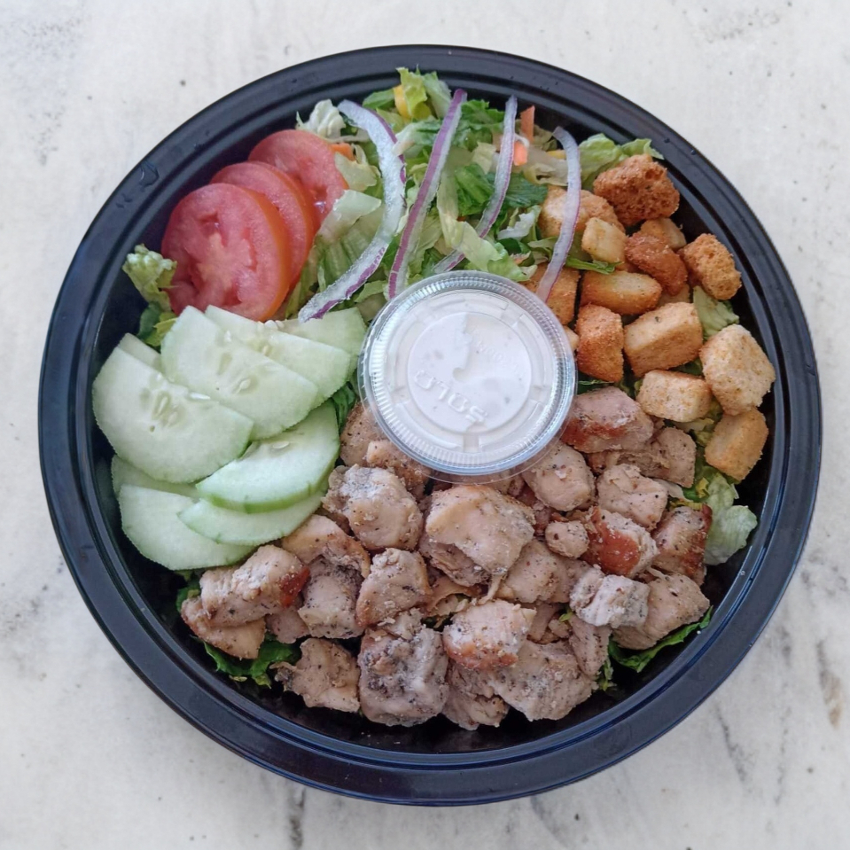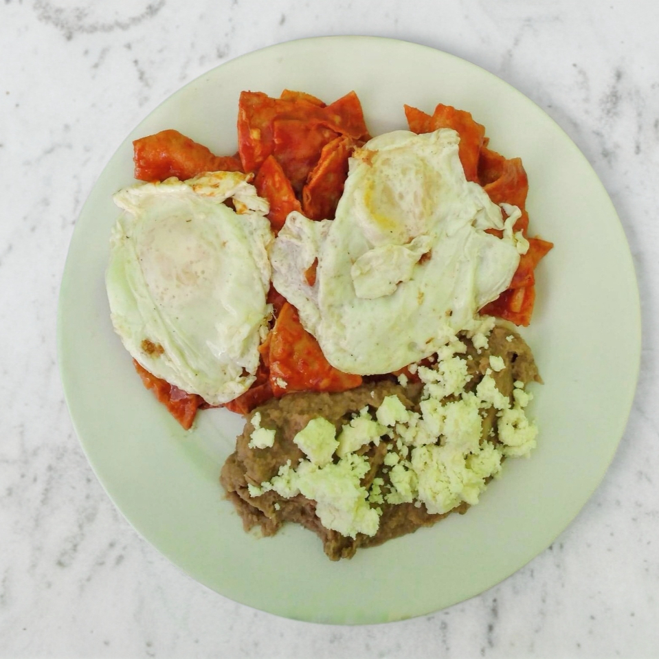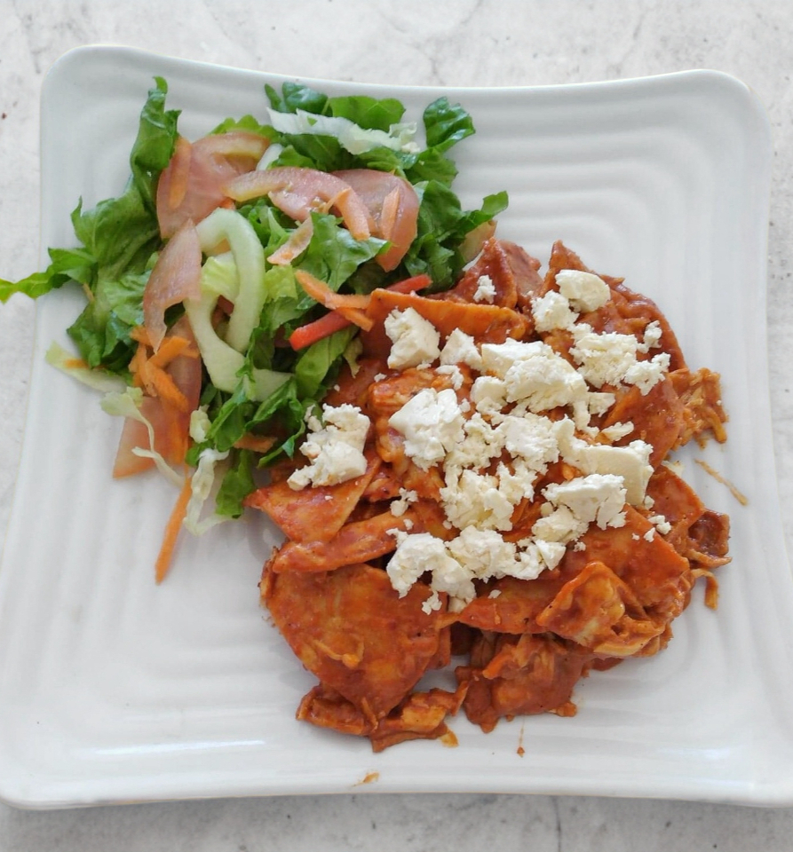 Chilaquiles con queso, acompañada de ensalada fresca y frijoles.