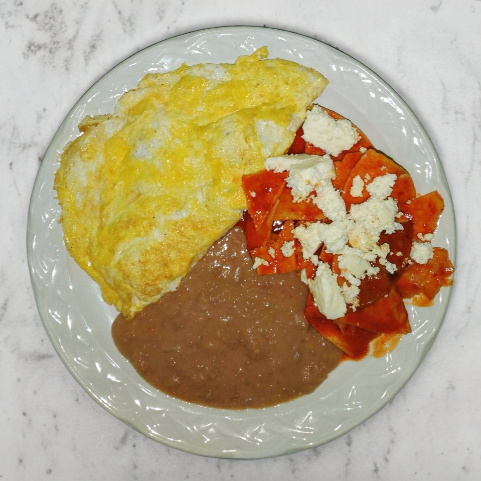 Acompañado de chilaquiles, frijoles y tortillas de maíz.
