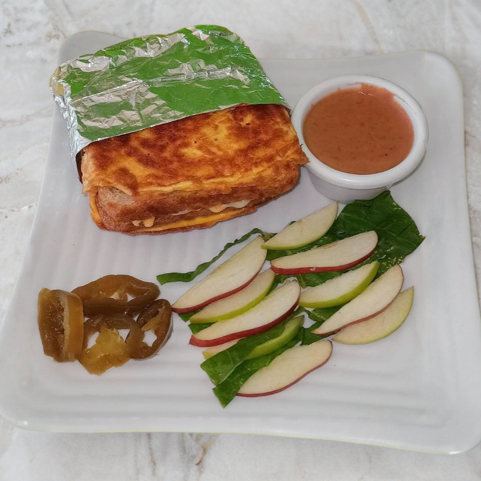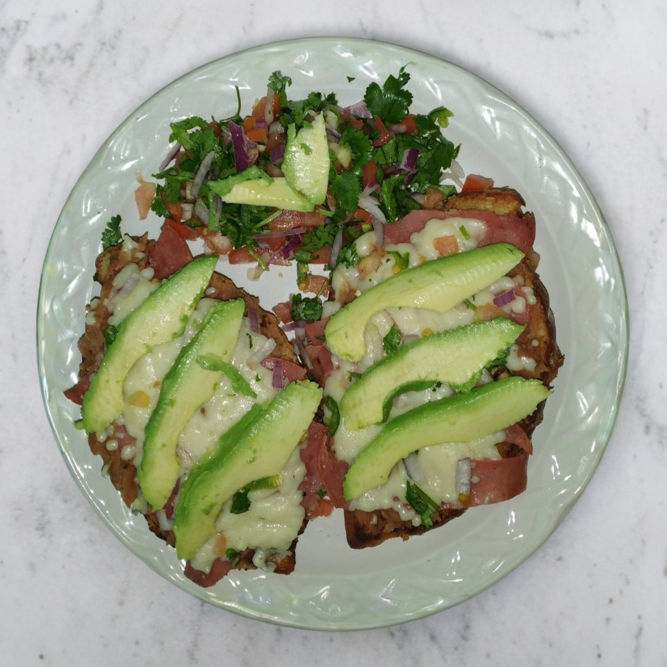 Con jamón, frijoles, aguacate, y salsa bandera.