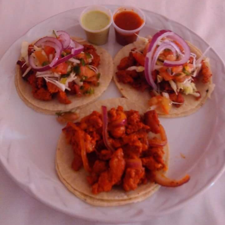 Tacos acompañado de burrito de frijol agua fresca, consome,