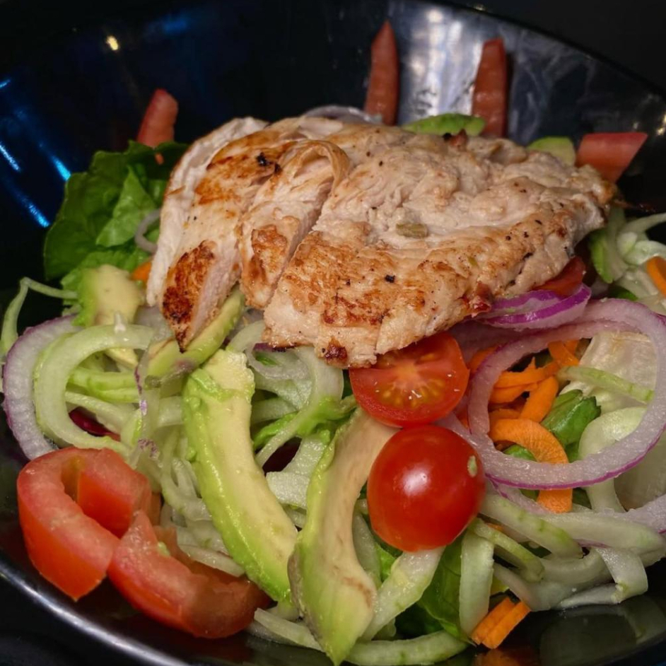 180 G de pollo marinado, lechuga, tomate, aguacate, pepino, cebolla morada y zanahoria con vinagreta y crutones.