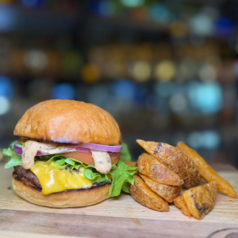 Hamburguesa con aderezo de la casa, carne de res 150 g, lechuga, tomate, cebolla morada y papas a elegir.