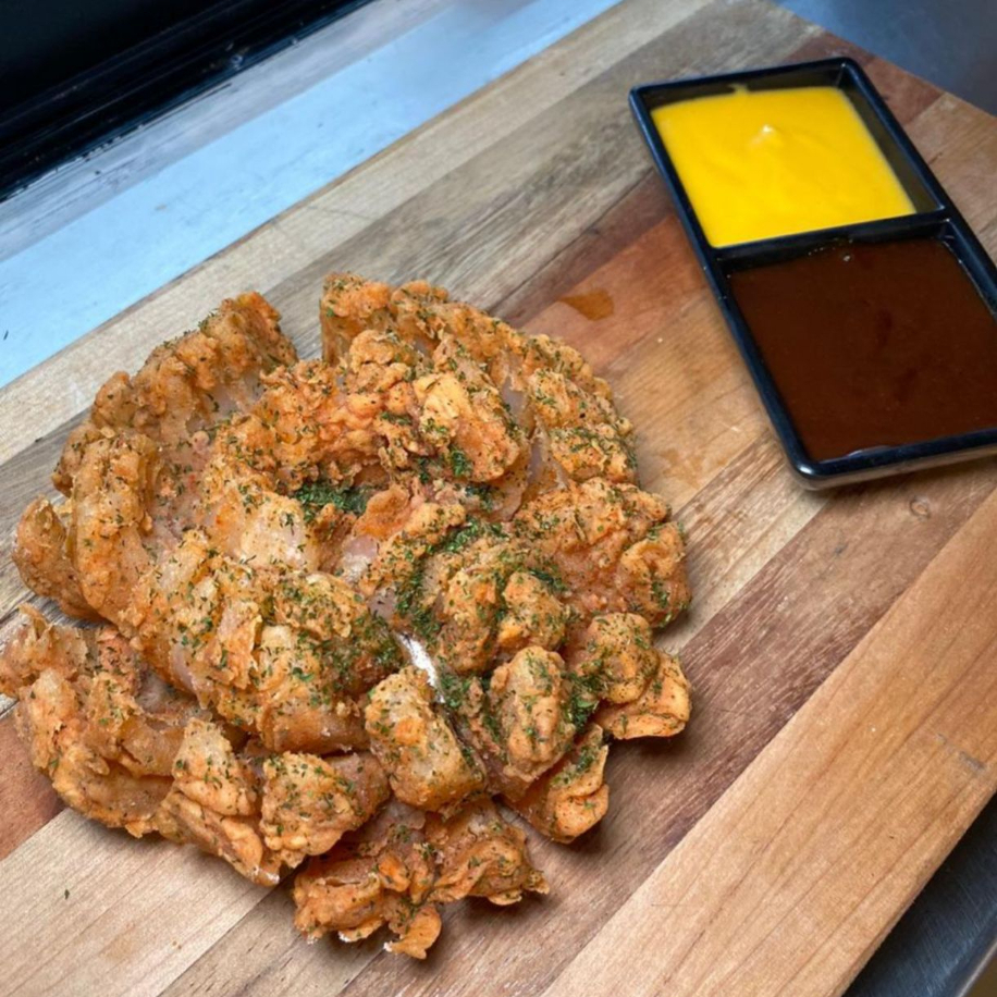 Cebolla empanizada, con salsa BBQ y queso amarillo.