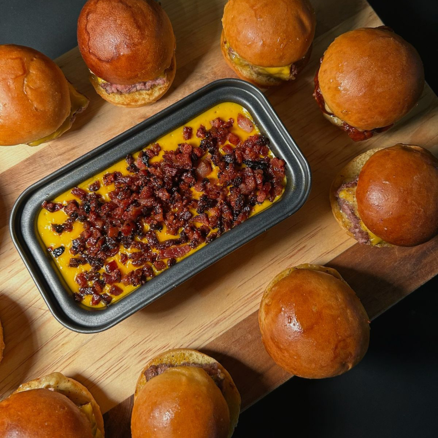 10 pzas de mini burger (8 pzas de carne de res y 2 pzas de boneless), acompañado de queso amarillo o papas Gajo.