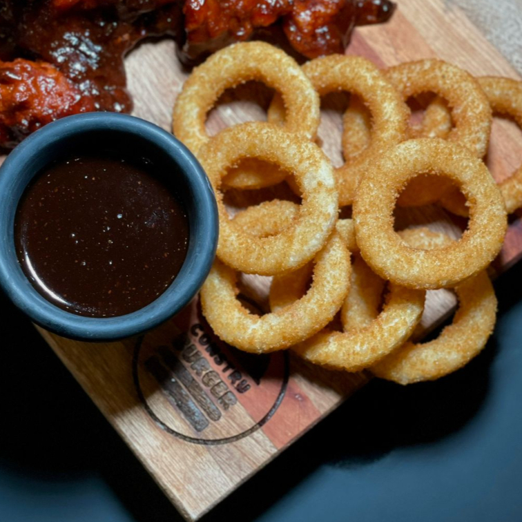 11 pzas de aros de cebolla, acompañado de salsa BBQ y queso amarillo.