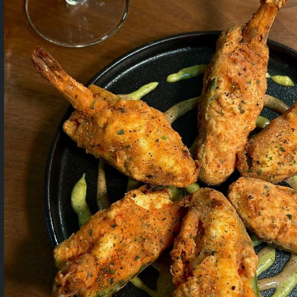 6 pz de camarones con jalapeños rellenos de queso crema empanizados