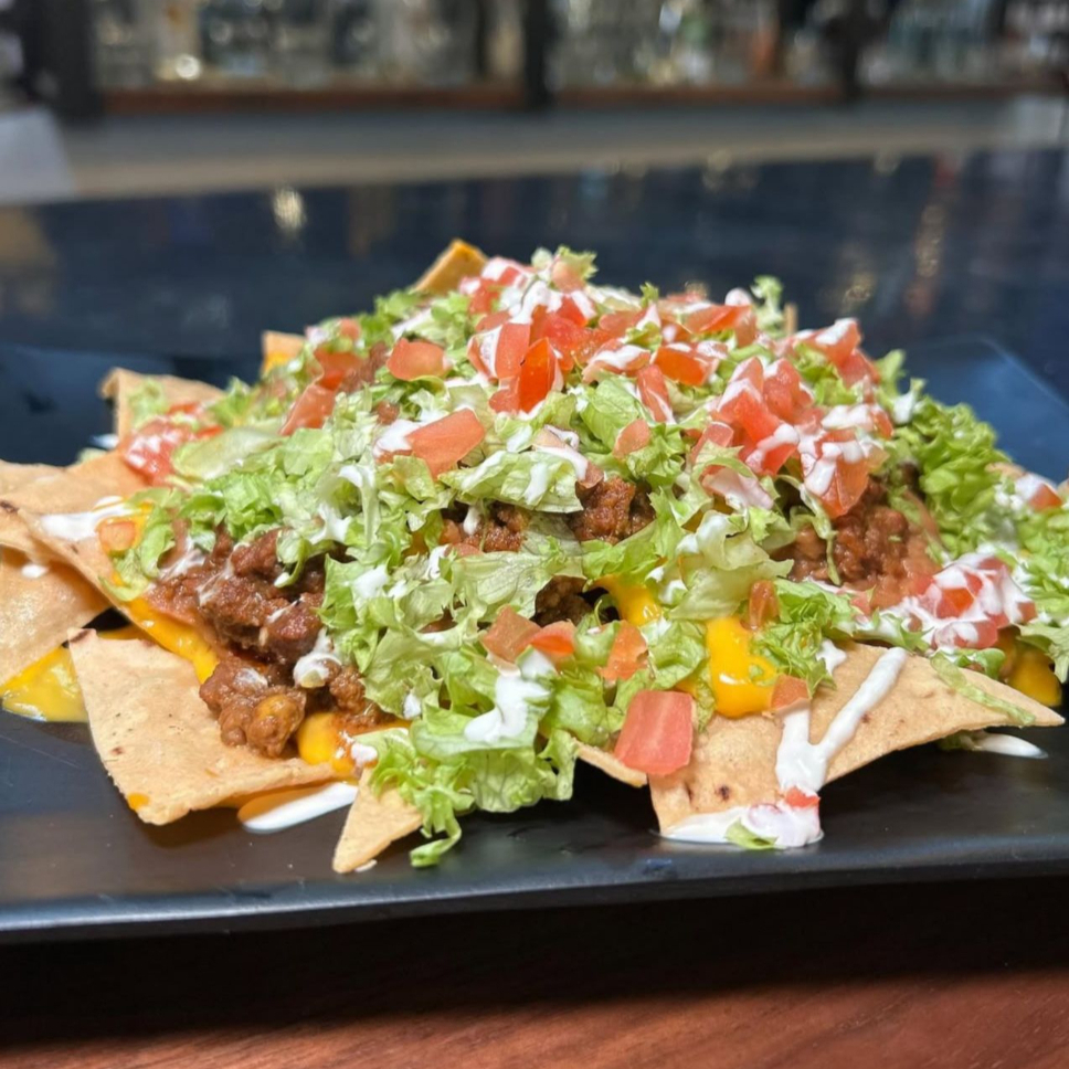 Nachos con carne, queso cheddar, lechuga, tomate, crema.