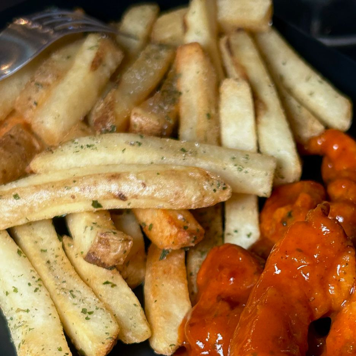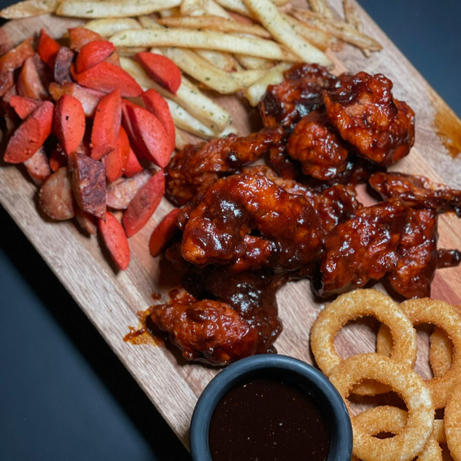 200 g de queso panela empanizado, 100 g de Boneless con salsa a elegir, 9 pzas de aros de cebolla y orden de papas a elegir.
