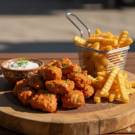 200 gr De pollo bañados en la salsa de tu elección, porción de papas a la francesa (200 gr) o puedes cambiar a papas sazonadas y aderezo ranch.