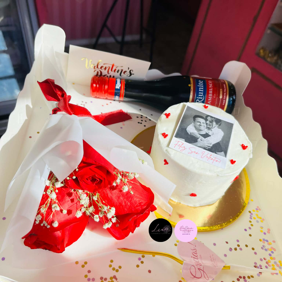 Obsequia esta hermosa cake box, incluye caja decorada con tarjeta, velita, pastelito 1-2 porciones con letrero de San Valentín y mini ramo de rosas rojas