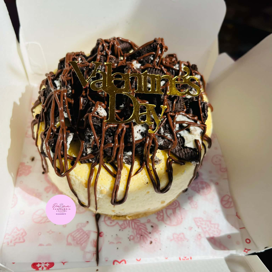 Riquísimo cheessecake 13 cm diámetro, 4 porciones, toppings: Oreo y Nutella. Incluye caja decorada velita y letrero de San Valentín