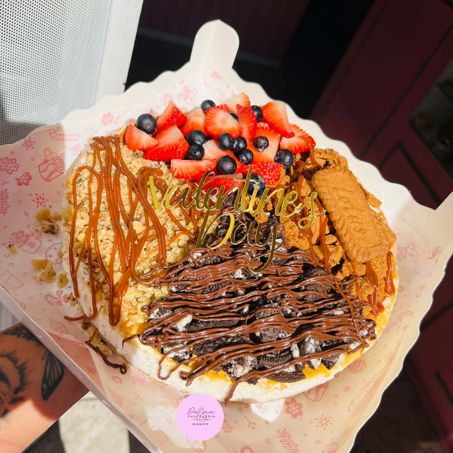 Riquísimo cheessecake horneado y con variedad de toppings mixtos, muy cremosito. Incluye velita y letrero de Valentines day en una caja muy bonita tapa de acetato.