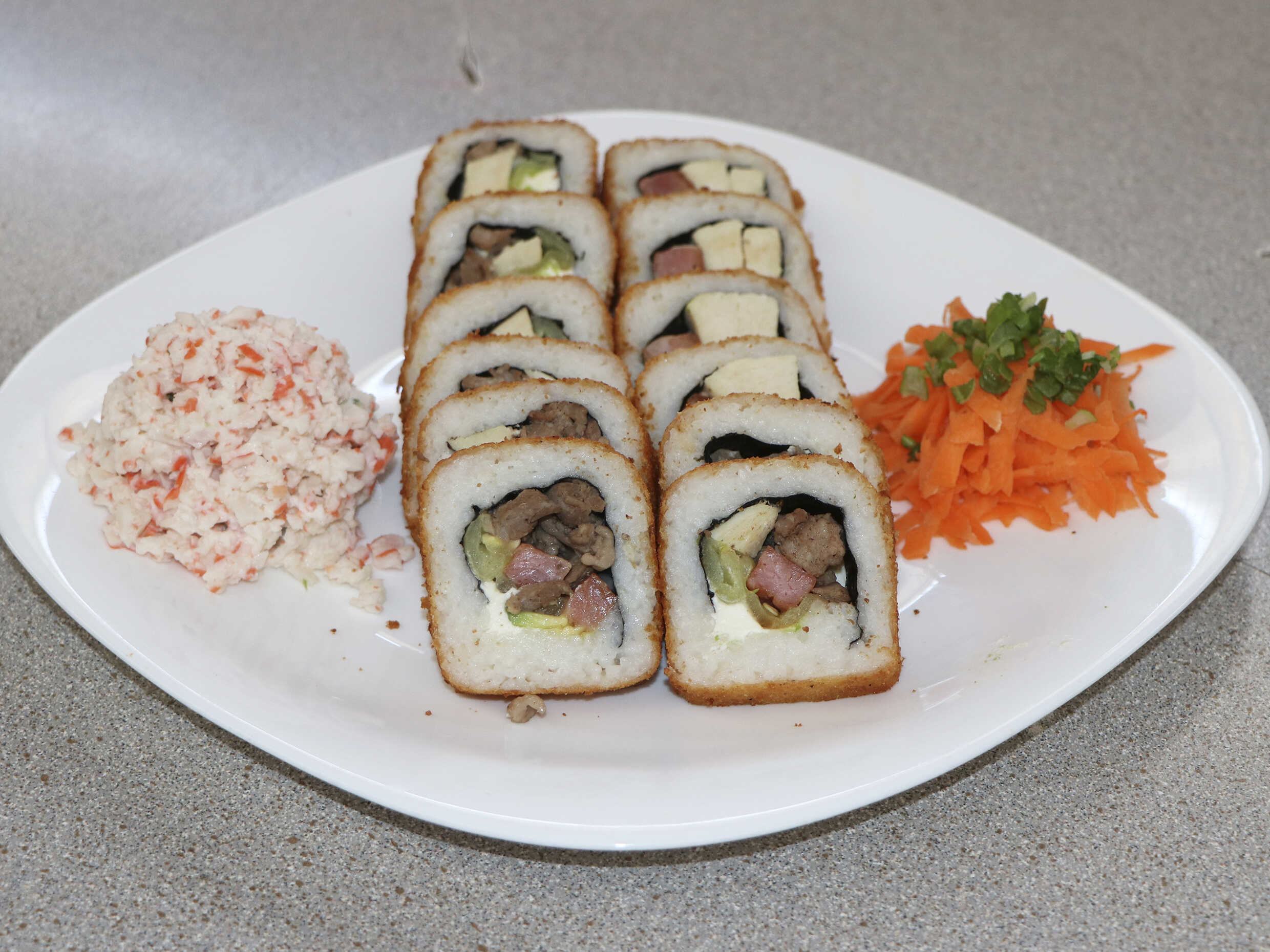Res, pollo, tocino, chile toreado, queso crema, aguacate.