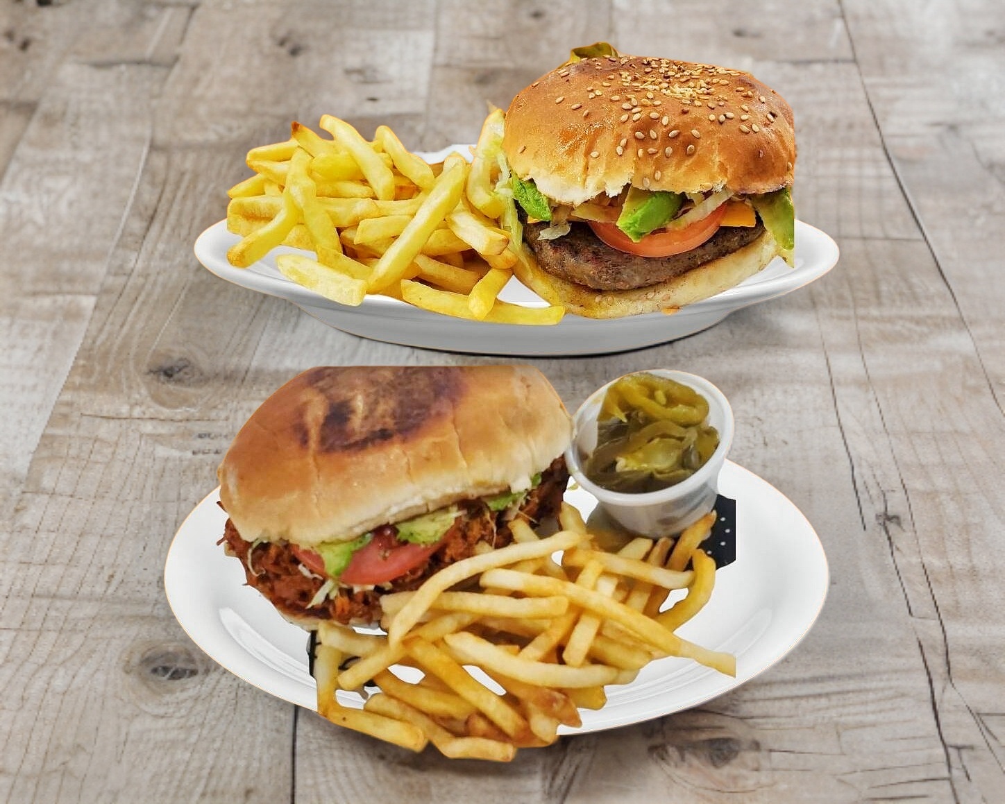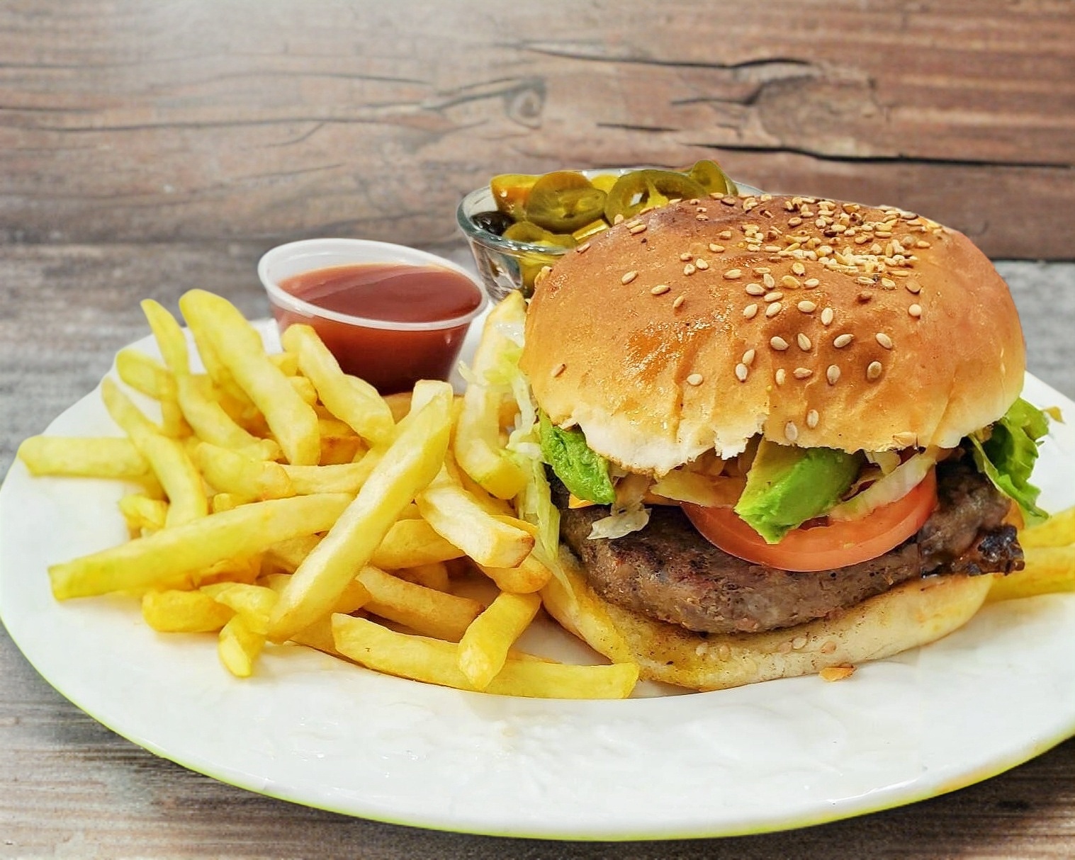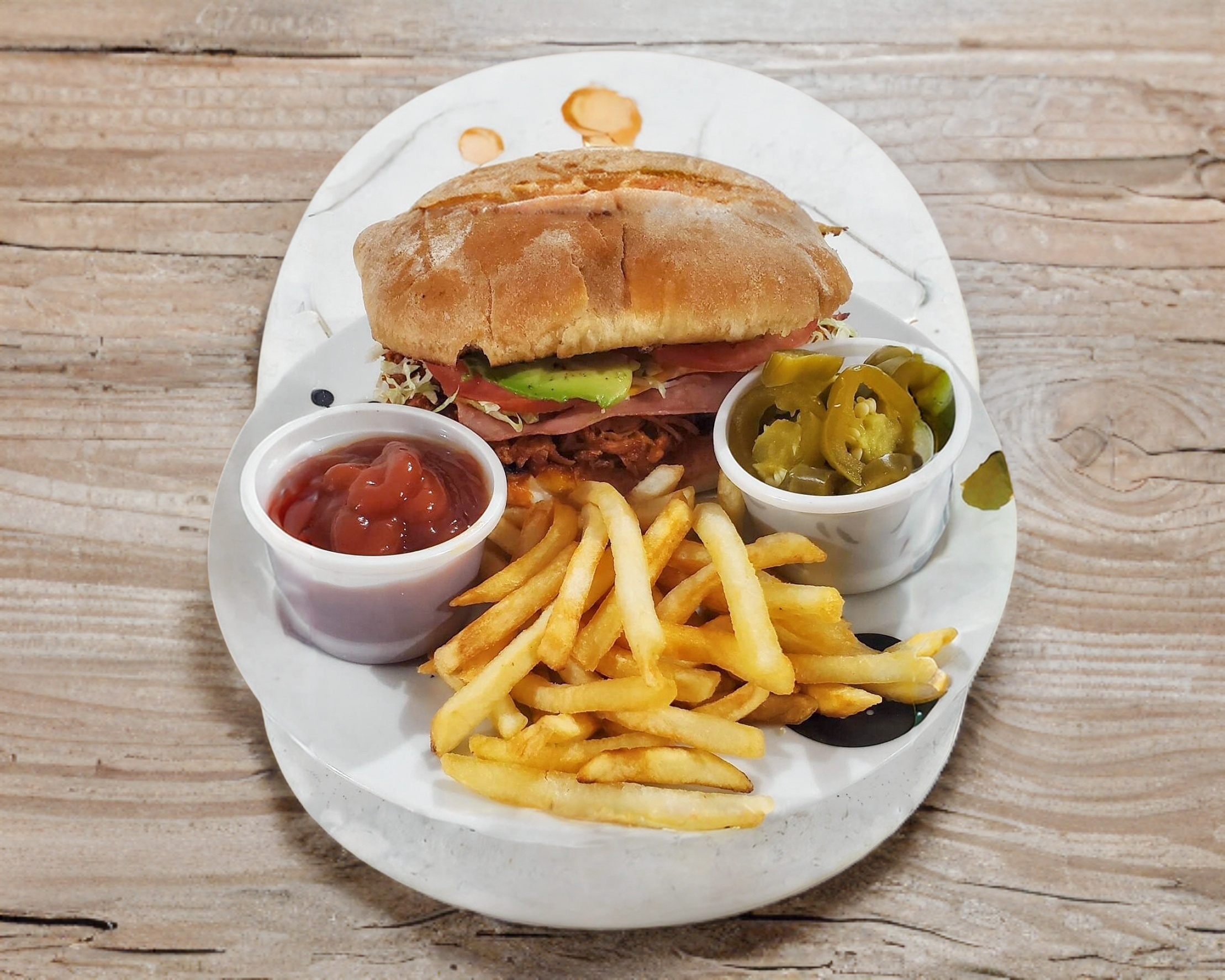 carne de pierna, queso Amarillo, jamon, lechuga, tomate, aguacate y papas fritas