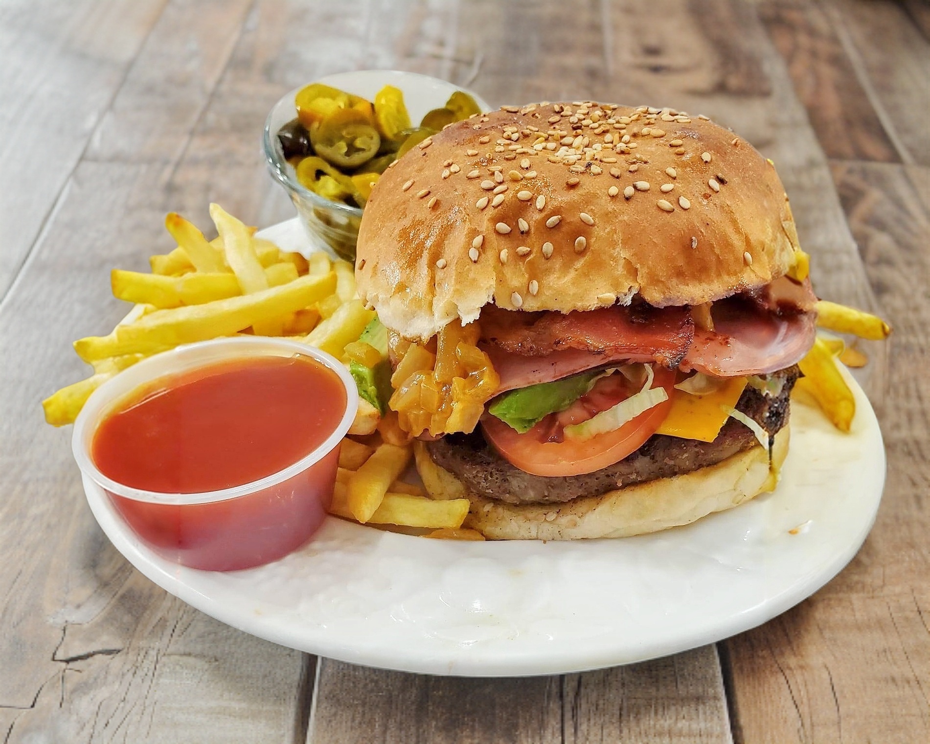 carne, queso Amarillo, tomate, lechuga, aguacate, jamon, tocino, aderezo de cebolla asada y papas