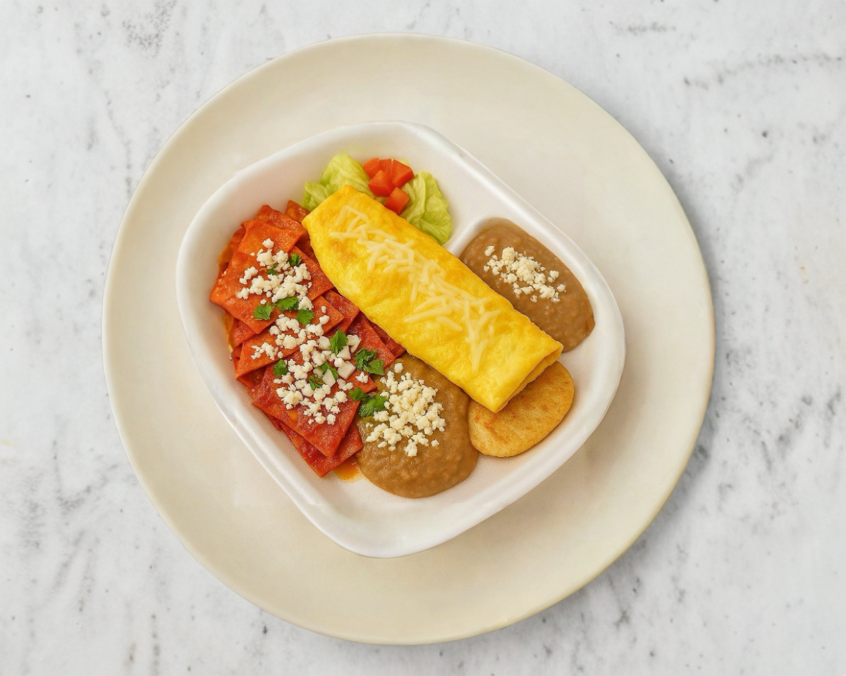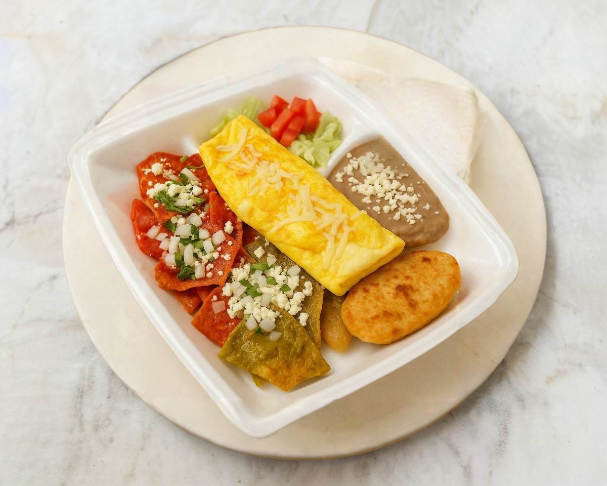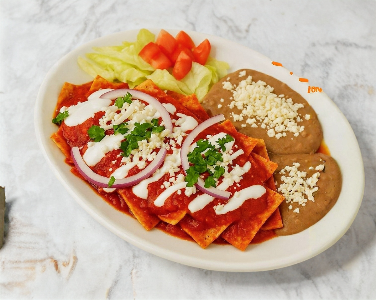 Chilaquiles rojos o verdes + 2 huevos + ensalada + frijol.