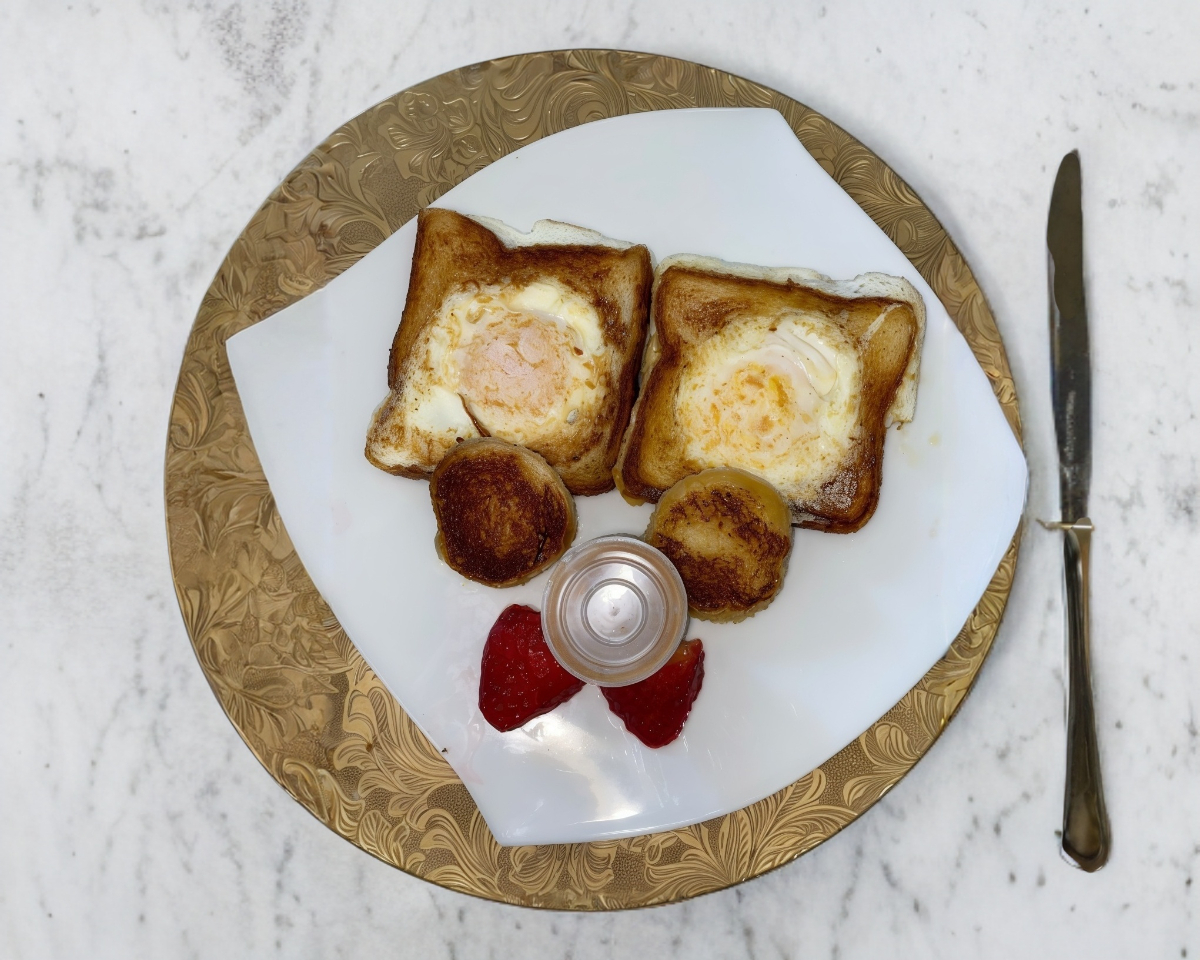 pan francés (3 piezas) con miel de maple. Pan frances doradito, suave por dentro, cubierto con azucar glass y acompañado de frutas fresca. Incluye miel para que te lo disfrutes al máximo