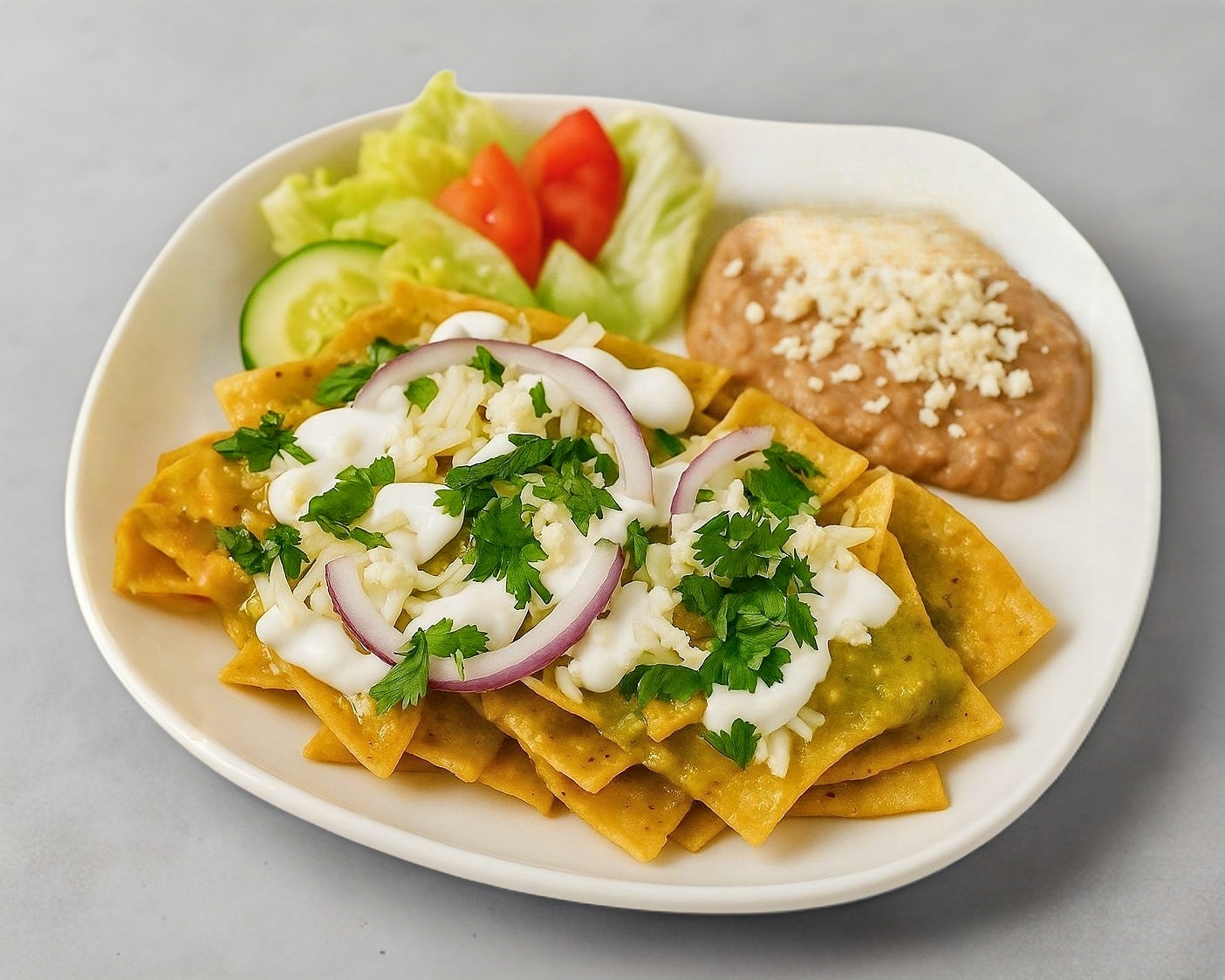 Totopos doraditos bañados en salsa verde casera, acompañados con crema, queso fresco rallado, cebolla.y cilantro,. Incluye frijoles refritos y ensalada fresca.