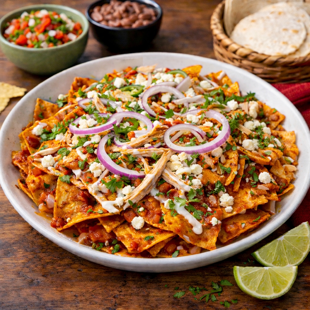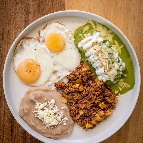 Totopos de maíz bañados en salsa verde cremosa y espesa, acompañados de pollo deshebrado, elote dulce, queso fresco y un toque de crema. Sabor suave, llenador y muy cremoso.