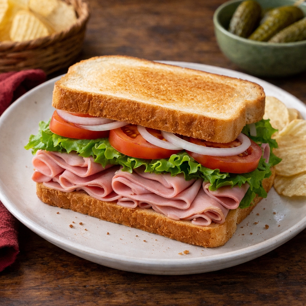 Dos huevos estrellados con dos rebanadas de jamón una salchicha guisada fritos y ensalada