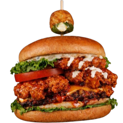 Pan brioche, doble carne smash con queso americano, lechuga, tomate, boneless buffalo, jalapeño poppers y aderezo ranch