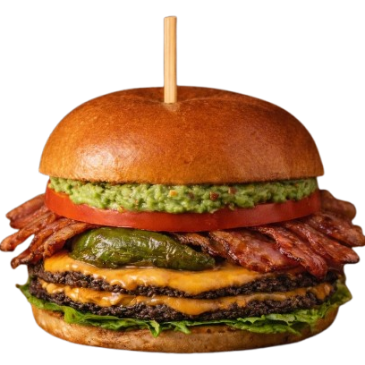 Pan brioche, doble carne smash con queso americano, tocino, guacamole. aderezo de la casa, lechuga y tomate
