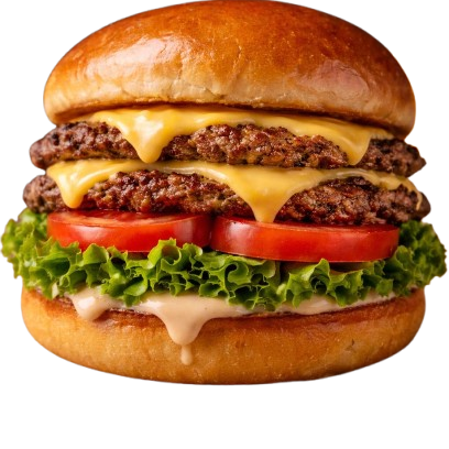 Pan brioche con doble carne smash, aderezo de la casa, lechuga, tomate queso americano