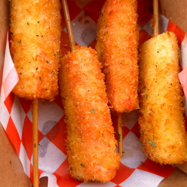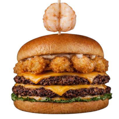 Pan brioche, doble carne smash con queso americano, lechuga, tomate, camarones empanizados y alioli de jalapeño