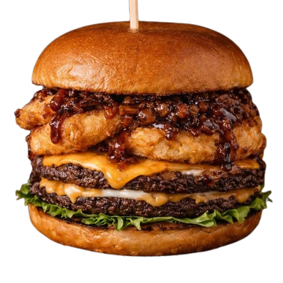 Pan brioche, doble carne smash con queso americano, aros de cebolla y mermelada de tocino, con aderezo de la casa, lechuga y tomate