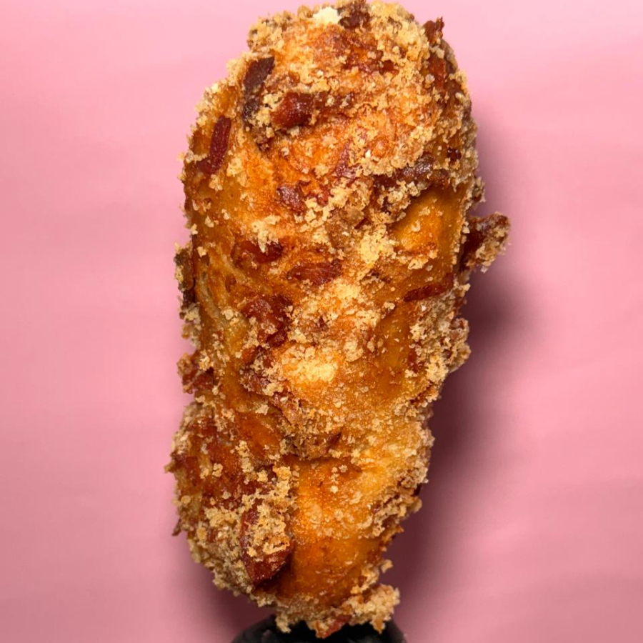 INDISPENSABLE ELEGIR INGREDIENTE. Masa receta exclusiva con trozos de tocino, empanizada con panko. Disfrútala con el topping de tu preferencia