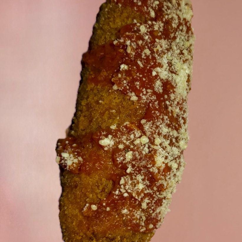 Queso menonita y pepperoni envueltos en masa receta especial, empanizado con panko y bañado en salsa para pizza y parmesano