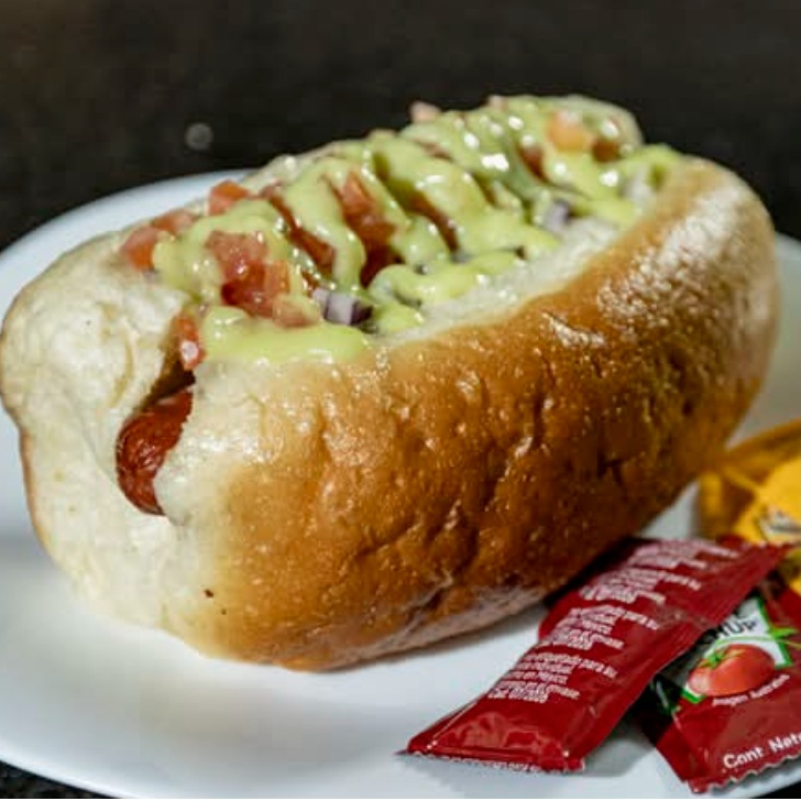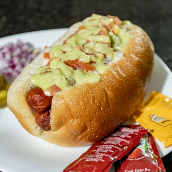 INCLUYE MAYONESA, 2 SALCHICHAS (SIN TOCINO), CEBOLLA MORADA, TOMATE Y GUACAMOLE.