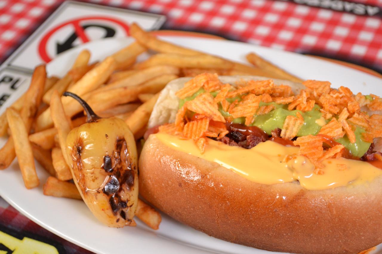 Hot dog con chile verde relleno de queso chihuahua, carne asada, cebolla asada, lechuga, tomate, mayonesa