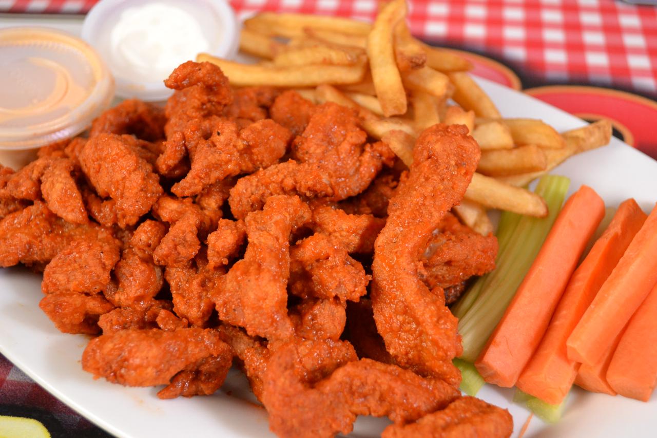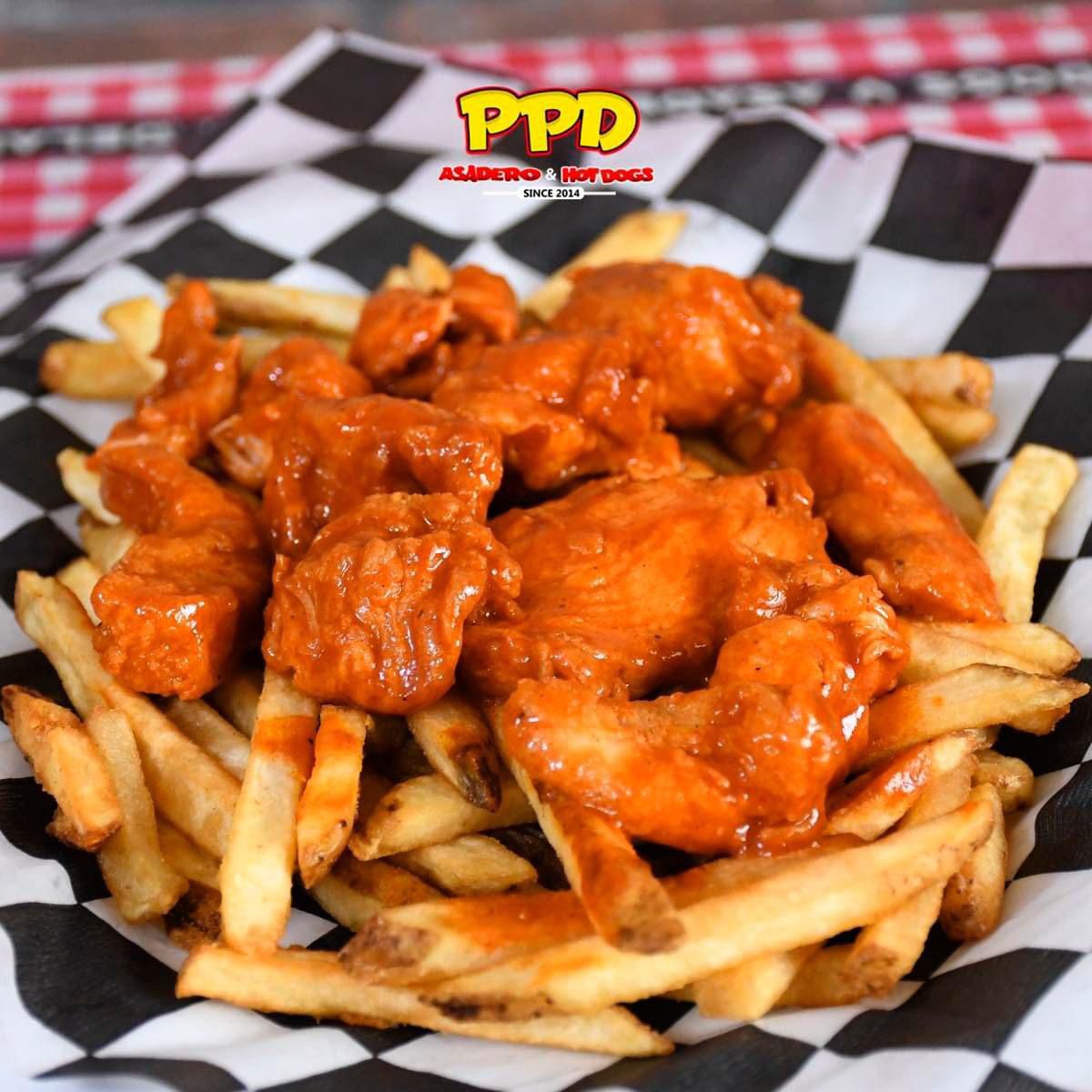 Boneless bañados en salsa de tu elección, queso chihuahua gratinado, cebolla asada, lechuga, tomate, mayonesa.