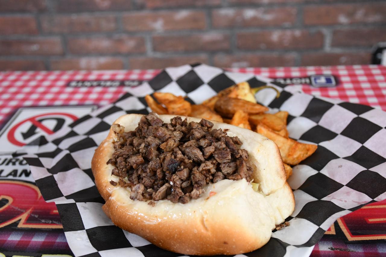Hamburguesa con carne arrachera, mayonesa y mostaza al pan, queso americano, cebolla asada, lechug y tomate.