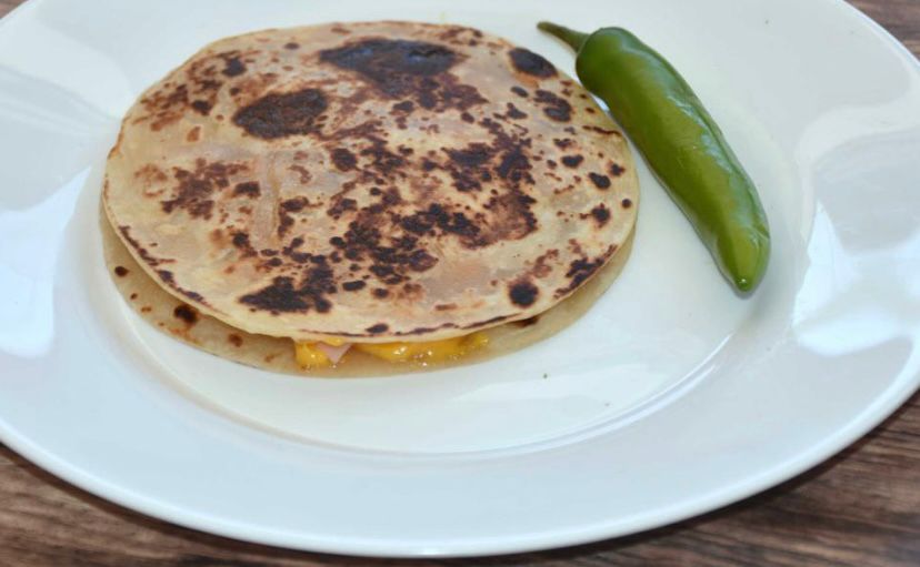 Tortilla doble gordita con queso chihuahua, queso amarillo,frijoles y jamon