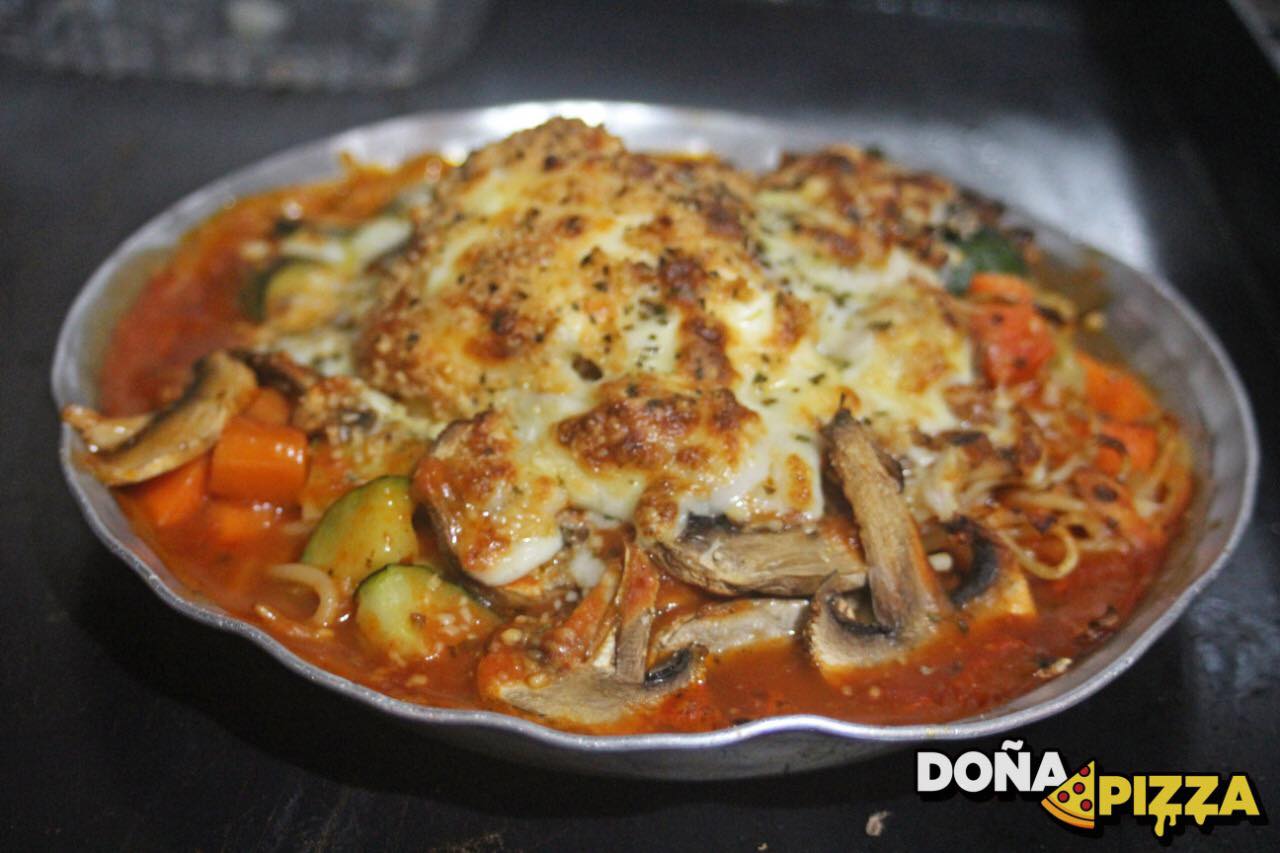 Salsa de tomate, carne molida, zanahoria, calabaza, champiñón, queso philadelphia y parmesano.