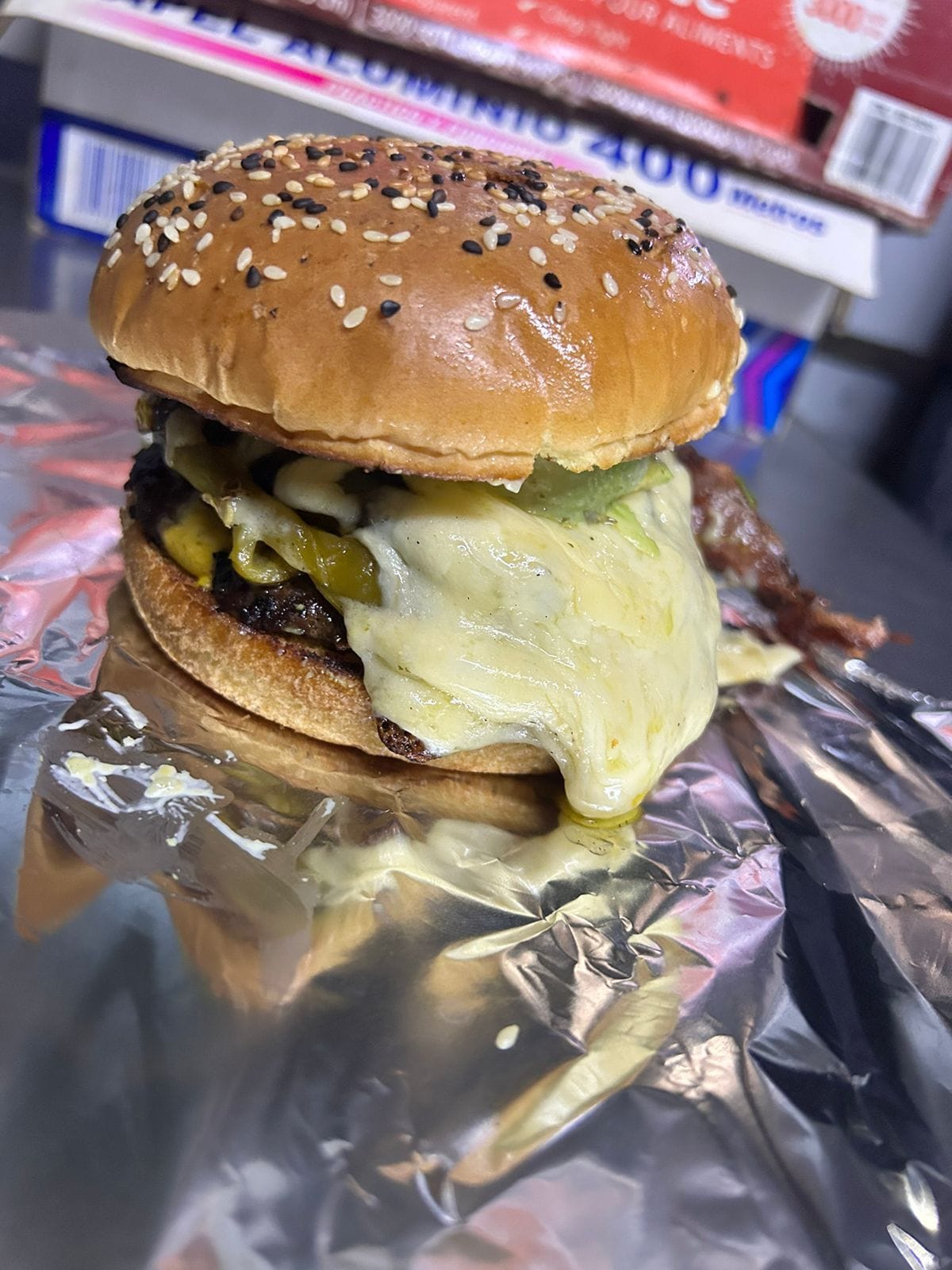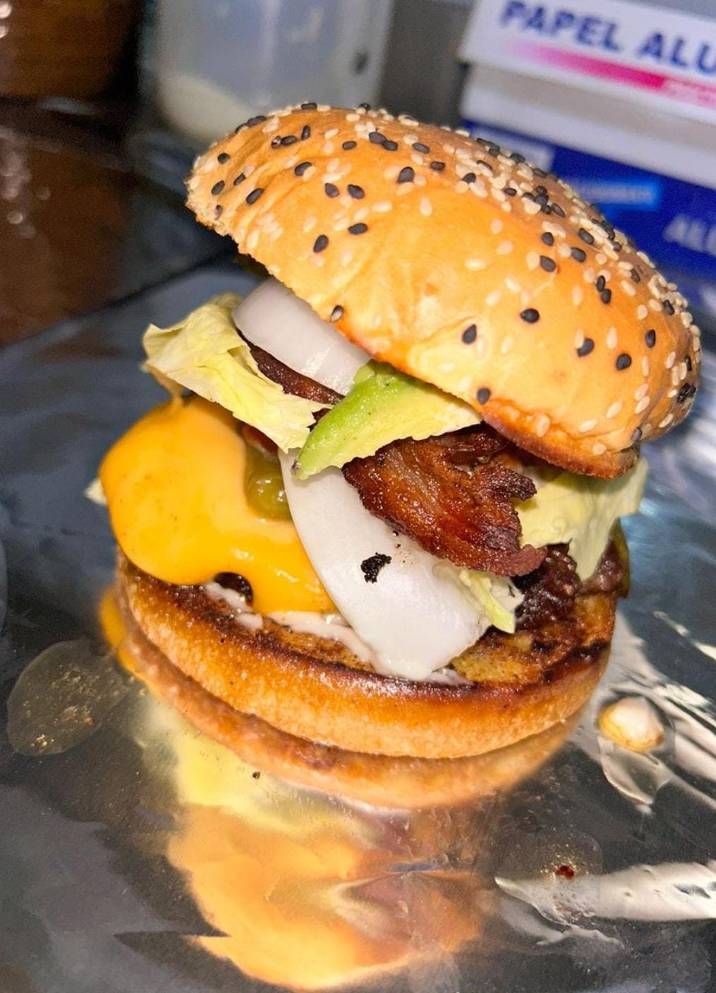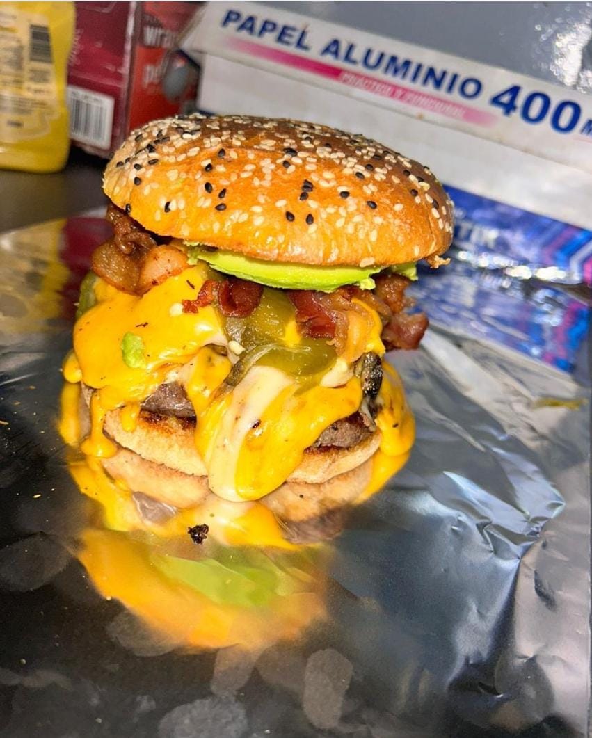 Hamburguesa doble carne, tocino, quesos, chile tatemado y aguacate.