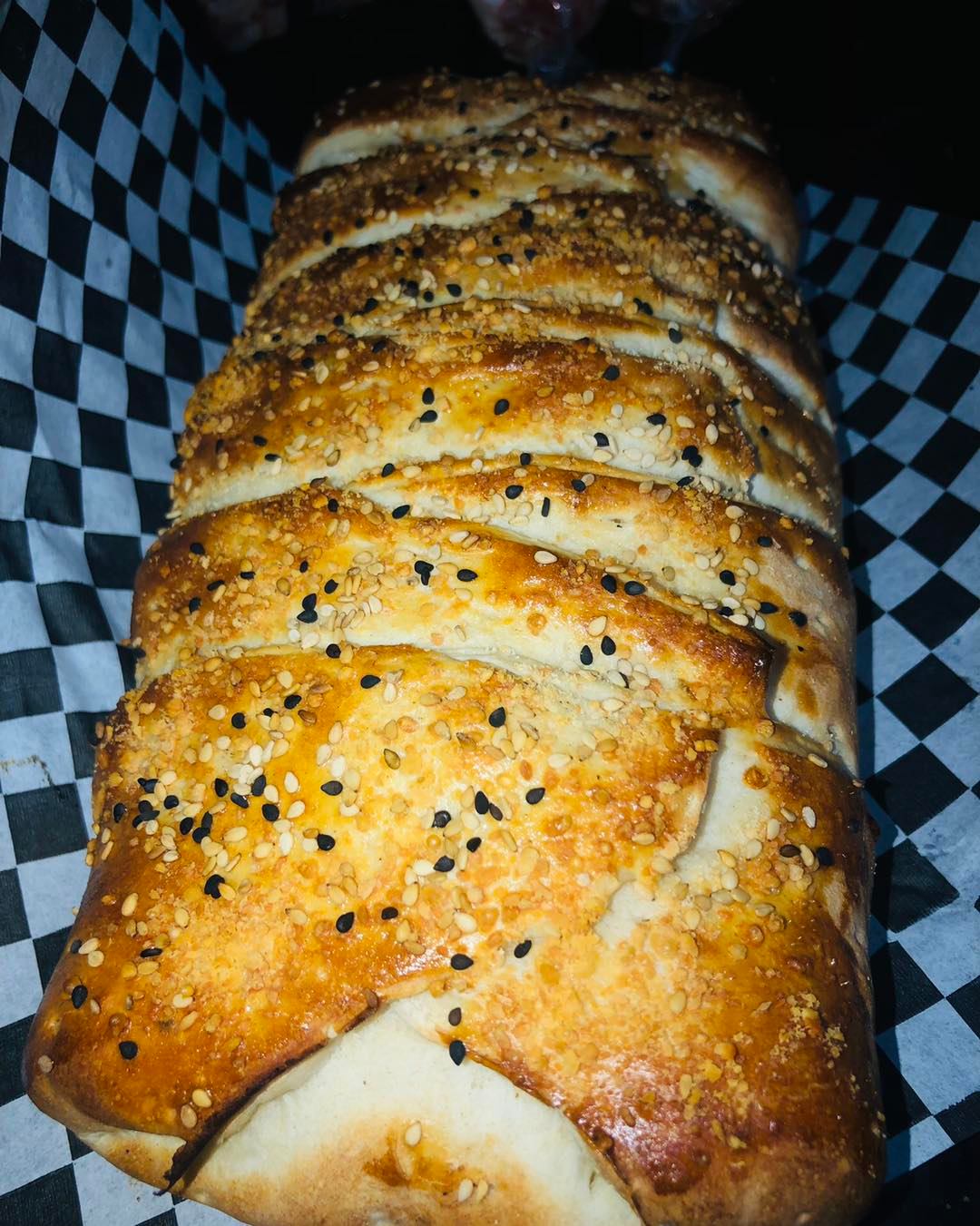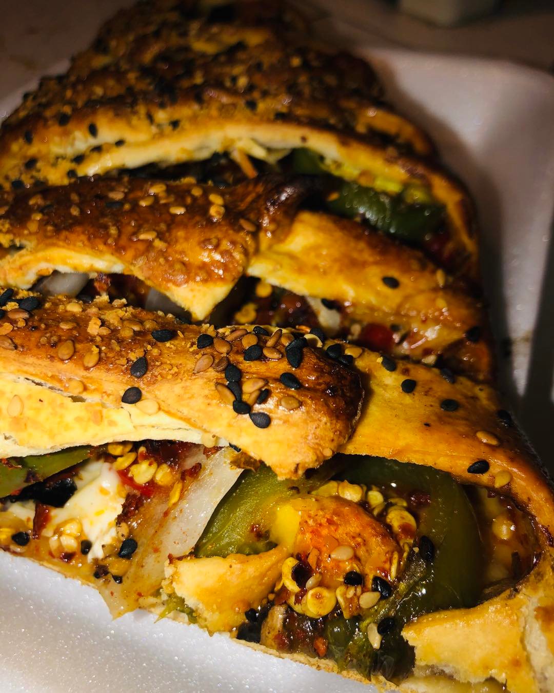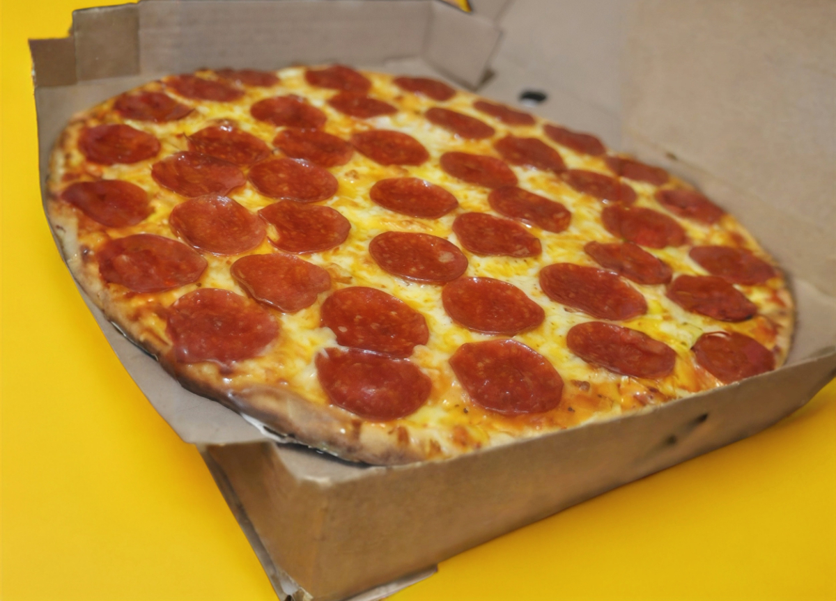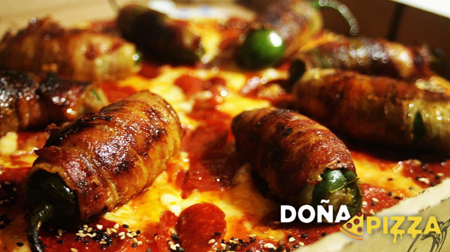 Pizza de pepperoni y chiles rellenos con chorizo y queso crema envueltos con tocino, con orilla sazonada con ajo y ajonjolí.