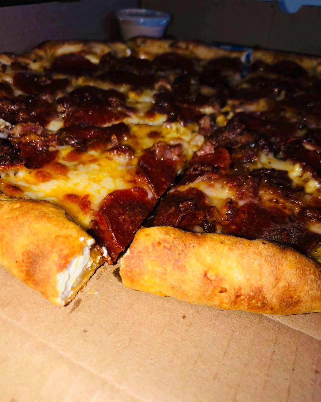 Pepperoni, champiñón, tocino, chilorio, pimiento, ajo y parmesano, con orilla sazonada y extra de queso.