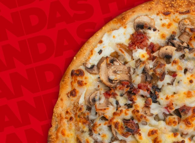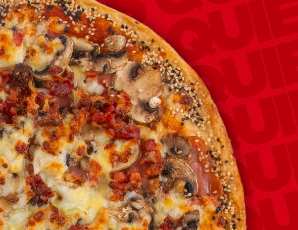 Cebolla caramelizada, champiñón, crema especial, tocino, ajo y parmesano, con orilla sazonada y extra de queso.