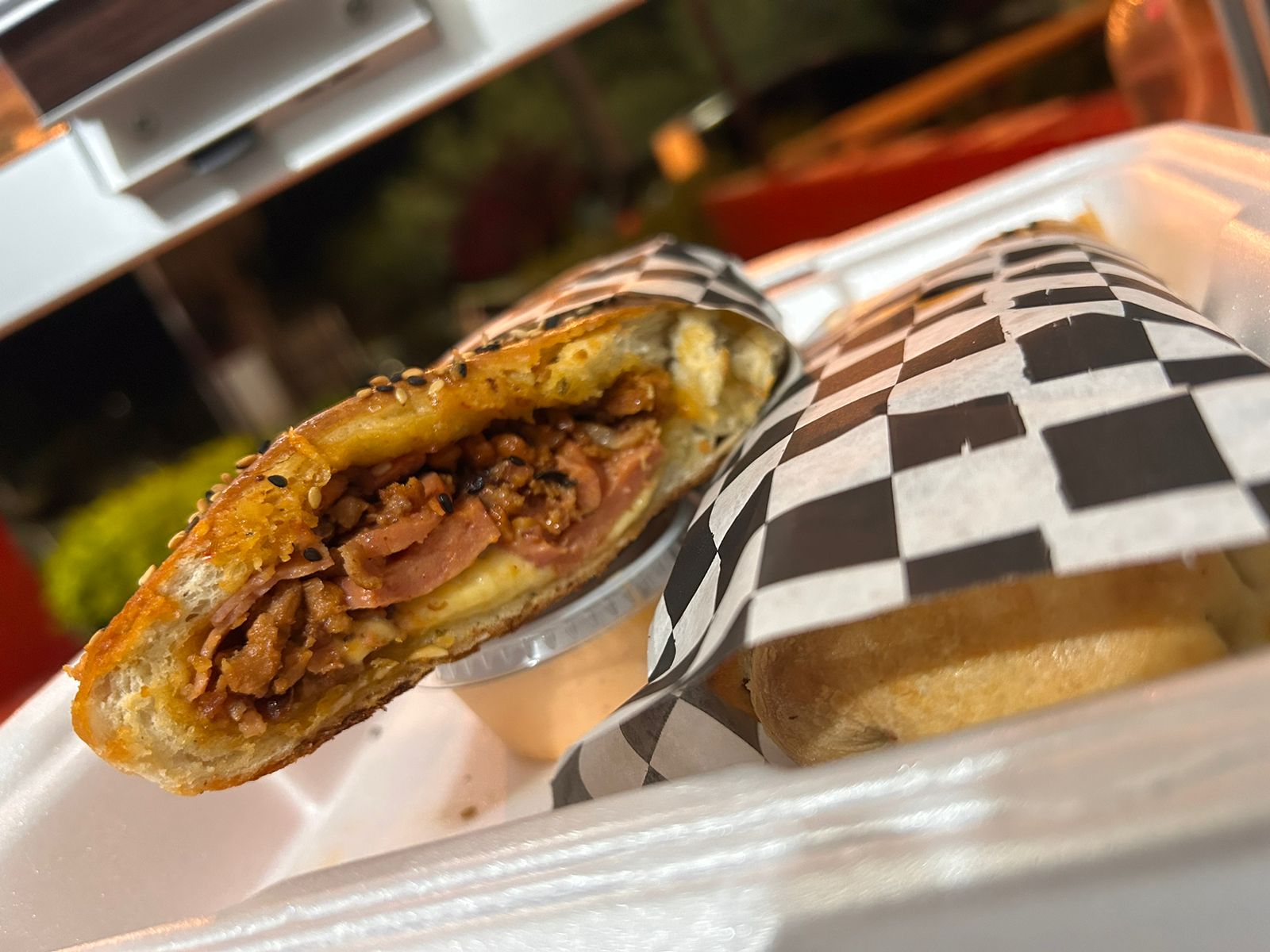 Hamburguesa con chile tatemado relleno de queso, tocino, aguacate y más queso.