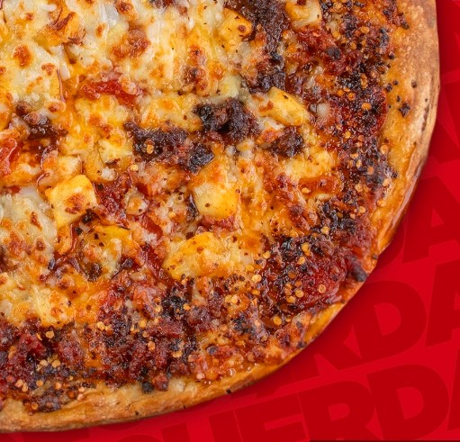 Pepperoni, chilorio, tocino, piña, ajo y pimientos secos (picante), con orilla sazonada y extra de queso.
