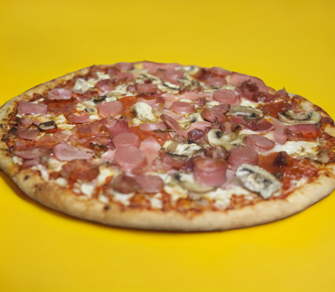 Jamón, champiñon, tocino, ajo y parmesano, con orilla sazonada y extra de queso.