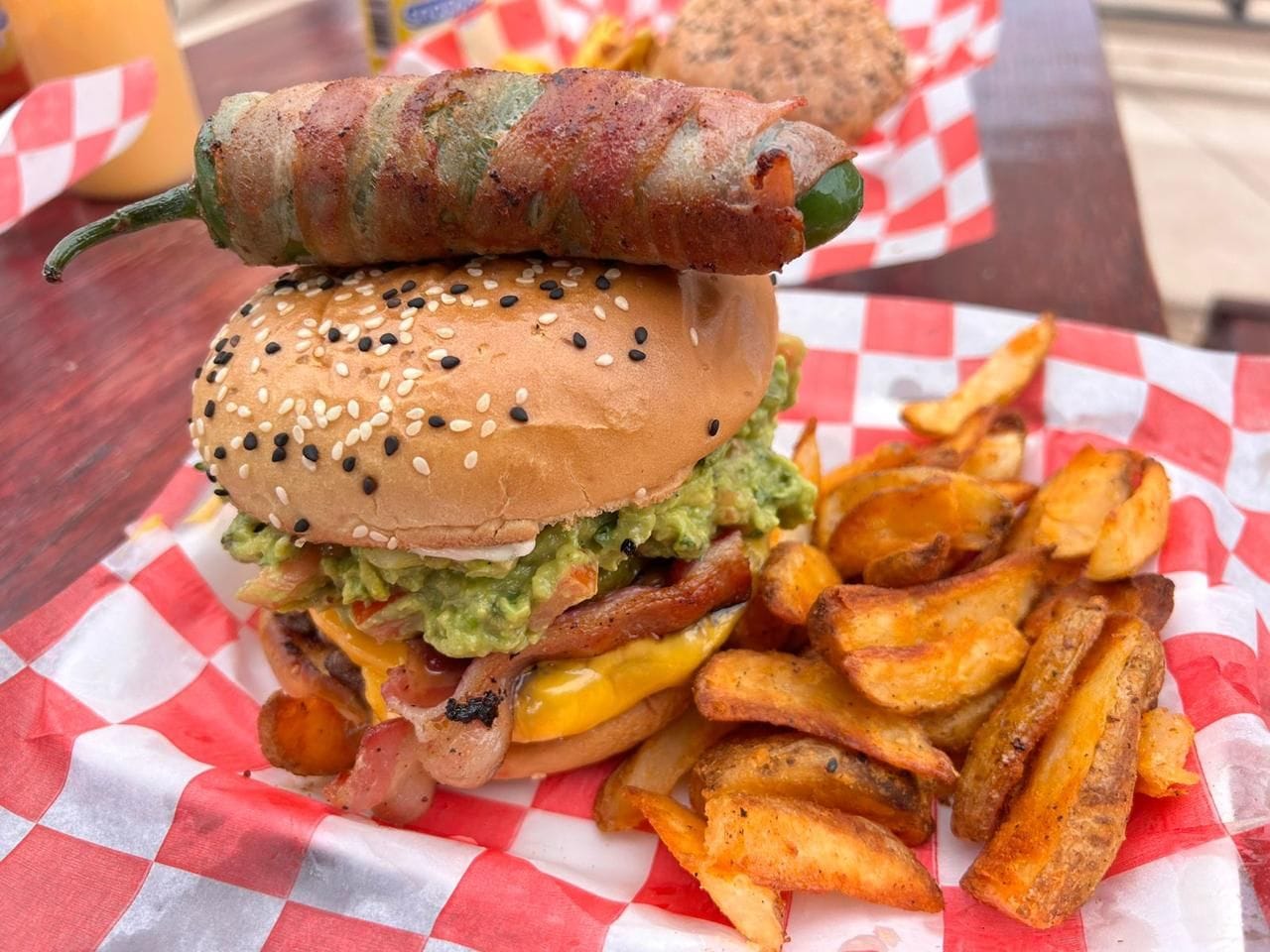 Hamburguesa con tocino, chile tatemado, queso y guacamole preparado. Incluye porción de papas a la francesa.