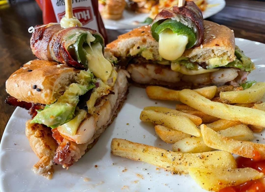 Hamburguesa de camarón envuelta en tocino y relleno de queso crema, aguacate. Incluye papas a la francesa.