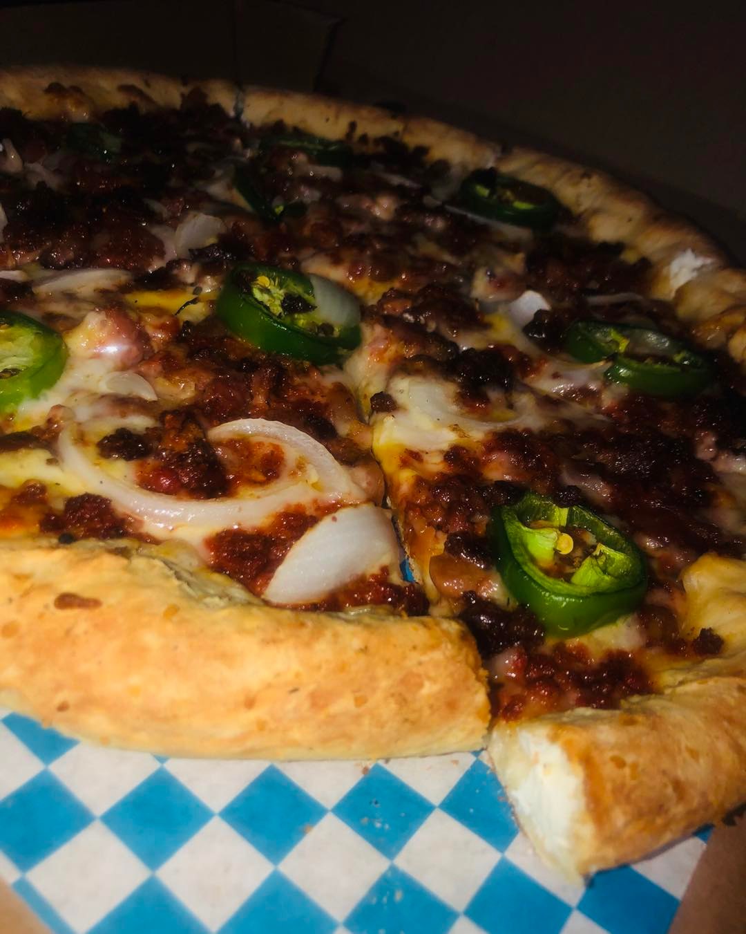 Pepperoni, chilorio, tocino, piña, ajo y pimientos secos (picante).