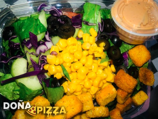Mezcla de verduras frescas y de temporada, acompañada de crutones, aderezos, semillas y frutos secos.