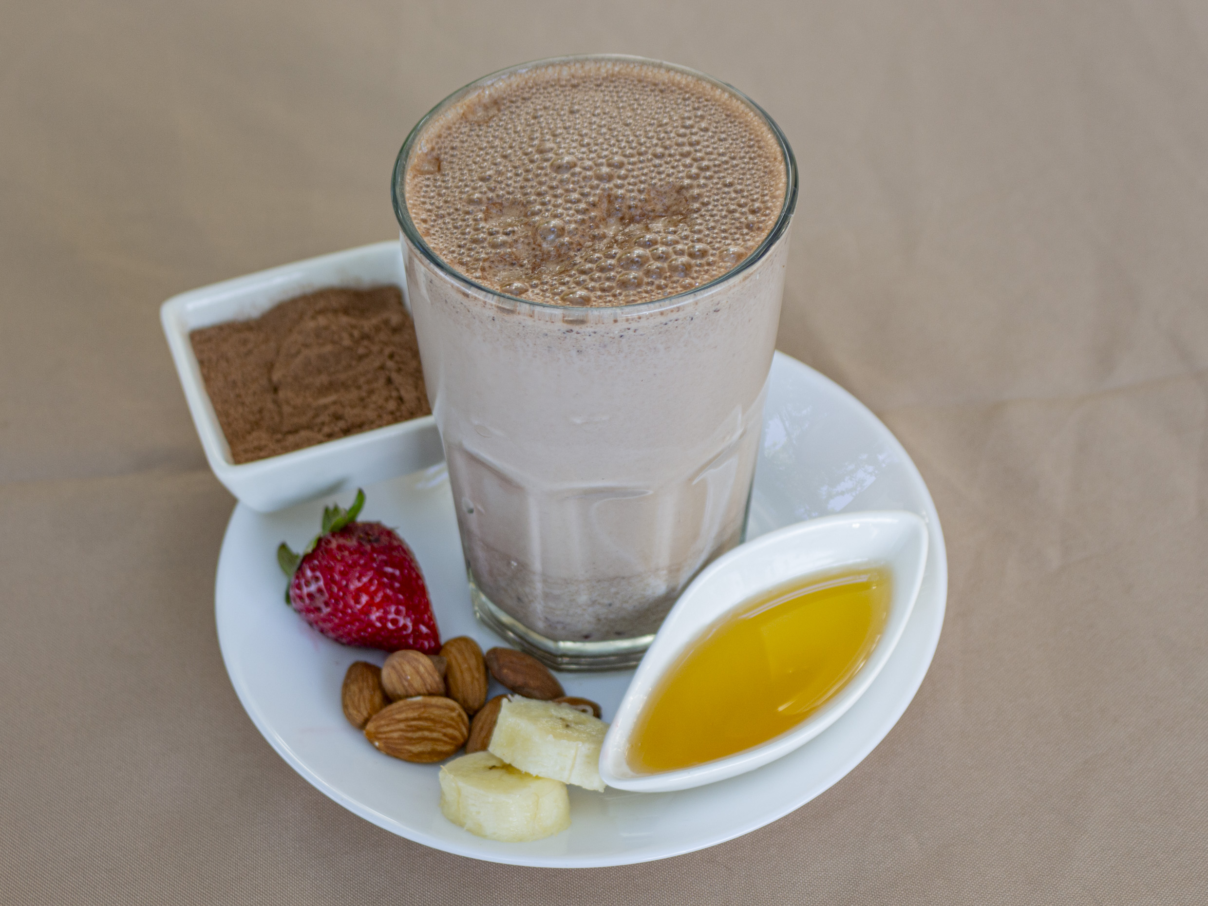 Plátano, chocolate, almendras, avena, canela y miel.